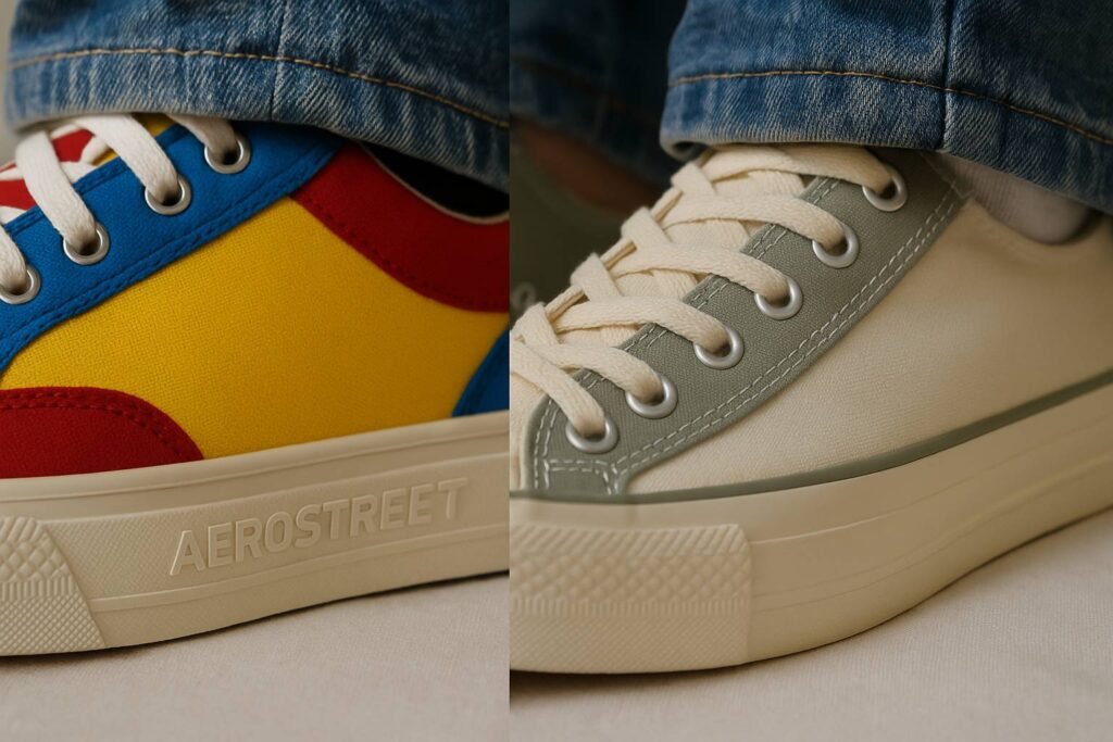 Keduanya sama-sama menggunakan material canvas dan rubber outsole, tapi detailnya yang bikin perbedaan signifikan di kenyamanan.