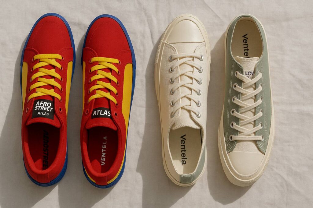 Ventela muncul dengan pendekatan berbeda: minimalist aesthetic yang timeless. Mereka jadi favorit anak-anak kampus dan pekerja kantoran yang mau tampil clean tanpa ribet. Brand ini terkenal dengan siluet low-top klasiknya yang versatile.