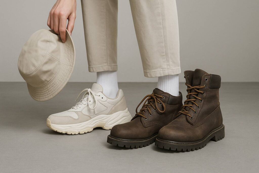- Work boots: Red Wing, Timberland, atau lokal seperti Onderhoud. Tinggi ankle dan sol yang tegas bikin siluet bawah terasa “grounded”.